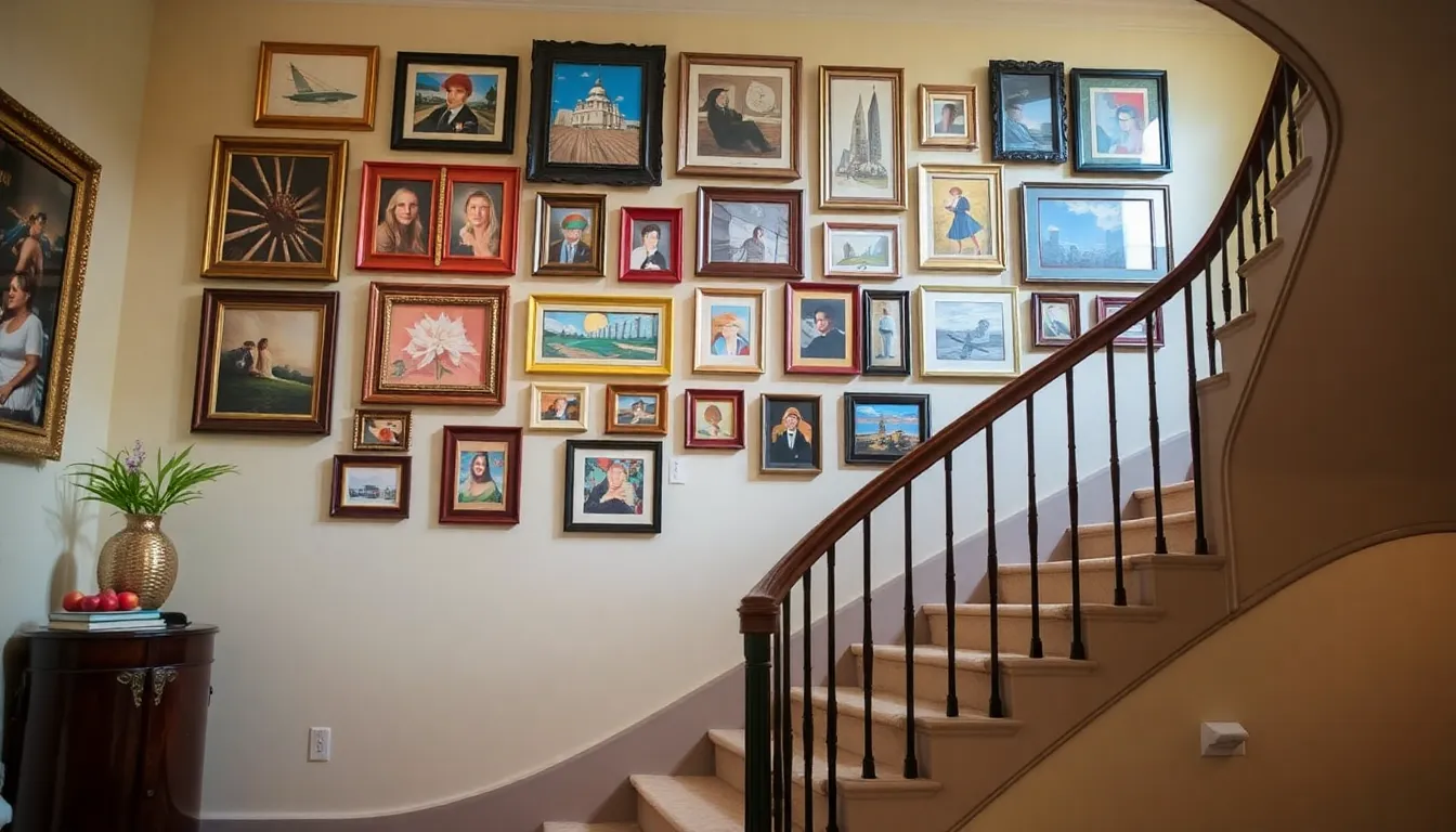 Art can elevate a staircase’s aesthetic. Incorporating various types of artwork and frames creates a vibrant display that captures attention.